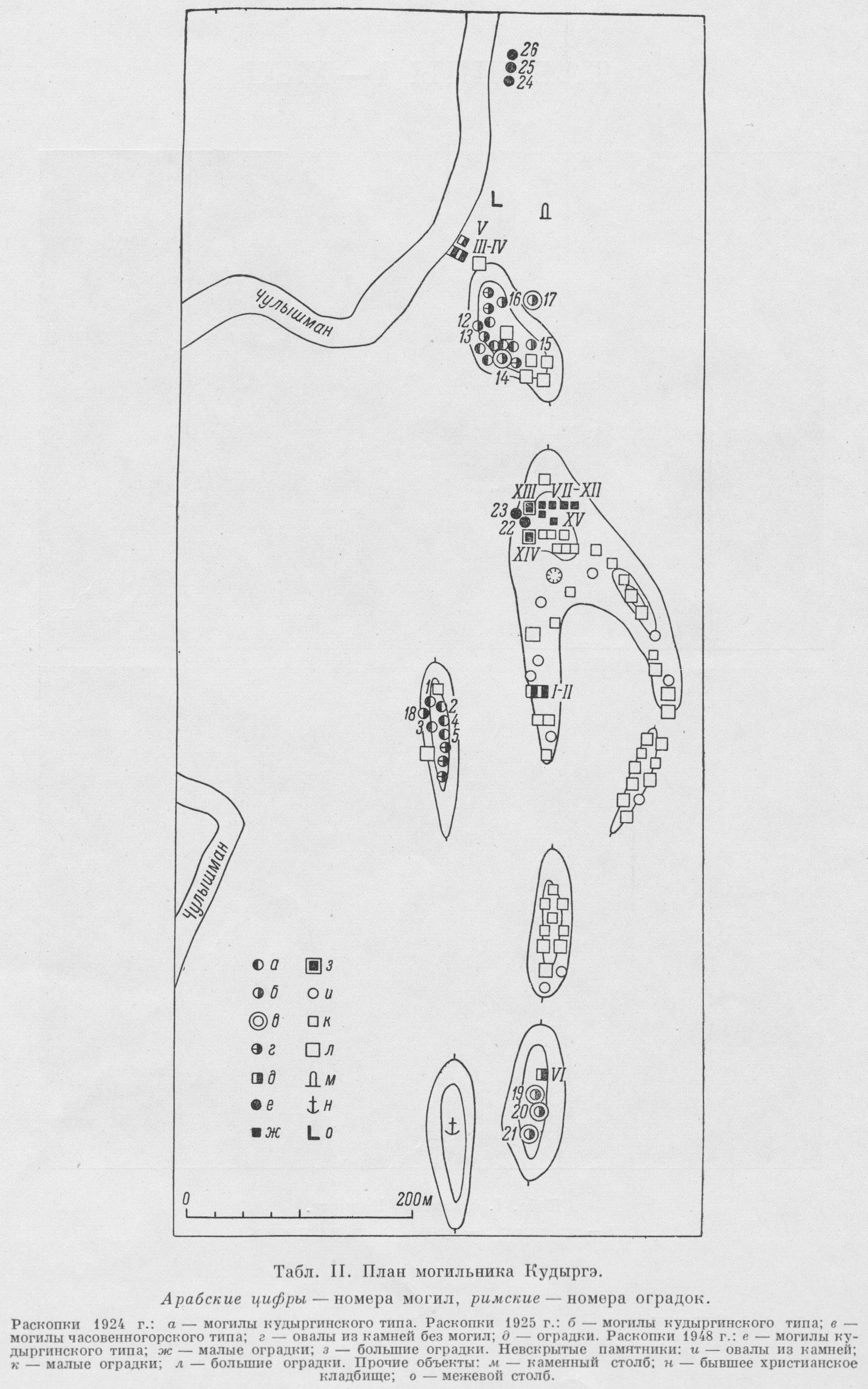 Раскопки 1925 г.: б — могилы кудыргинского типа; в — могилы часовенногорского типа; г — овалы из камней без могил; д — оградки;