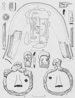 А — план могилы; 1 — украшение шапки; 2 — нож; 3 — палочка в оправе: а — сбоку, б — развёртка оправы; 4 — зеркало; 5, 6 — кружки от неизвестного предмета; 7 — серьга
