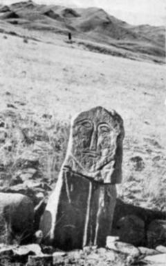 ^   Рис. 71. Изваяние №37 (общий вид изваяния и камней-балбалов с северо-востока).