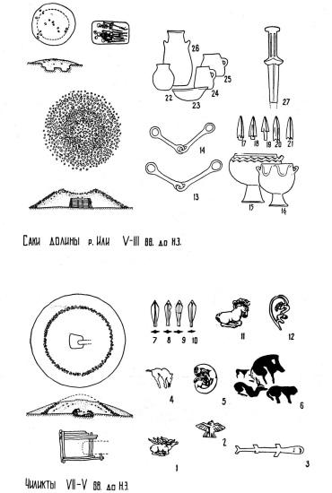 1-4 — Чиликты, курган 5; 5 — Тамураши II, группа 3 (петроглифы); 7-11 — Чиликты; 12 — Иссыкский клад; 13 — Текели; 14, 15 — Иссыкский клад; 16, 17 — Бесшатыр; 18 — Акжар; 19 — Чирик-рабат; 22 — Киик-су; 23, 24 — Кзылауз III, курган 82; 25-27 — Семиречье; 28 — Иссыкский клад.