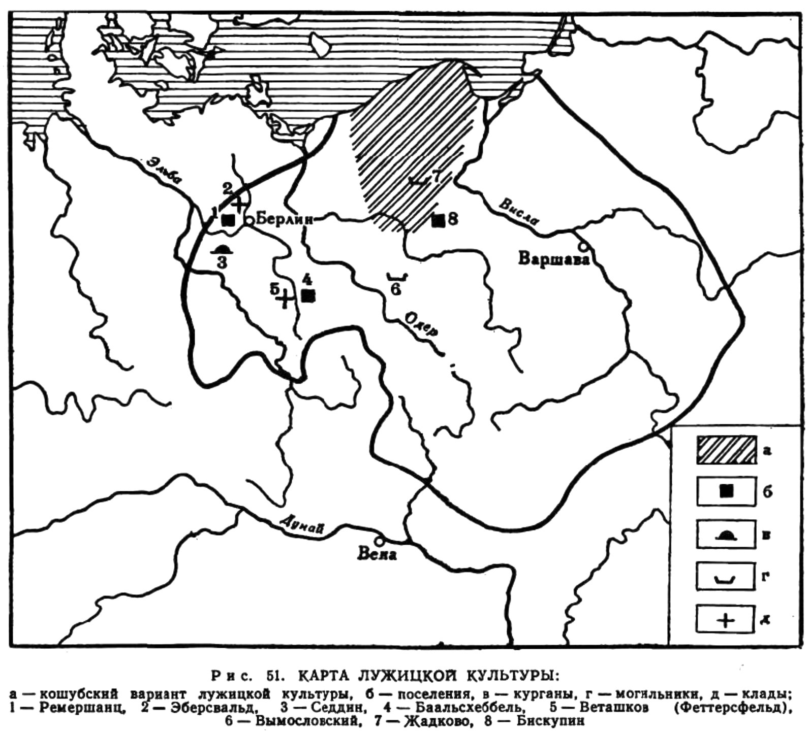 Однако связывать данные Тацита о германцах первых веков Римской империи с лужицкими племенами трудно. Поэтому даже Г. Коссина, вдохновитель нескольких поколений шовинистически настроенных германских археологов, предпочитал считать эти племена сначала карпидами, а затем иллирийцами, что очень сомнительно ввиду гораздо более южных и исконных связей иллирийцев. [25]