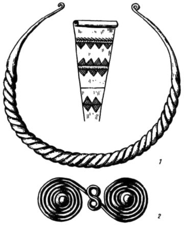 Рис. 64. Гривна (1) и фибула (2) лужицкой культуры.(Открыть Рис. 64 в новом окне) |