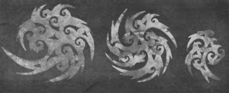 сколько рядов камнями и затем покрыто земляной насыпью диаметром около 25 м. В катакомбе, в большой колоде погребена старая женщина. И эта могила ограблена, но часть костей сохранила своё первоначальное положение. Скелет лежал в вытянутом положении, на спине, головой на север. Наиболее интересной находкой являются украшения головного убора, вырезанные из довольно толстого листового золота (рис. 3) и роговой гребень с барельефным орнаментом (рис. 2). Орнаментальные мотивы золотых пластинок имеют ряд аналогий в художественных изделиях Китая эпохи Хань, но возможно, что они изготовлены на месте по китайским образцам. Среди костей найдены также золотые накладки на крупные гранчатые бусы, деревянная пуговка и железный нож с характерной для этой эпохи рукояткой, составляющей одно целое с клинком.