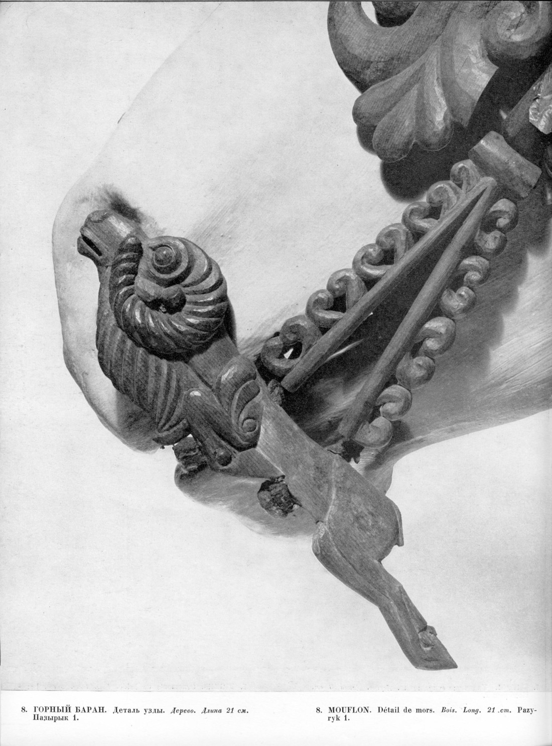 Широко развернувшиеся после Октябрьской революции археологические исследования на Алтае доставили нам огромное количество разнообразных памятников искусства ранних кочевников Алтая, но не сразу. В малых курганах, содержавших погребения представителей рядового населения, художественно выполненные изделия находились редко и только сделанные из металла и кости. Раскопки же огромных курганов потребовали больших затрат. Исследование первого такого кургана, произведенное в 1927 г. автором настоящих строк в урочище Шибе, дало новую серию художественных изделий из дерева (рис. 4), кости и металла и позволило определить условия нахождения и сохранности памятников искусства ранних кочевников.