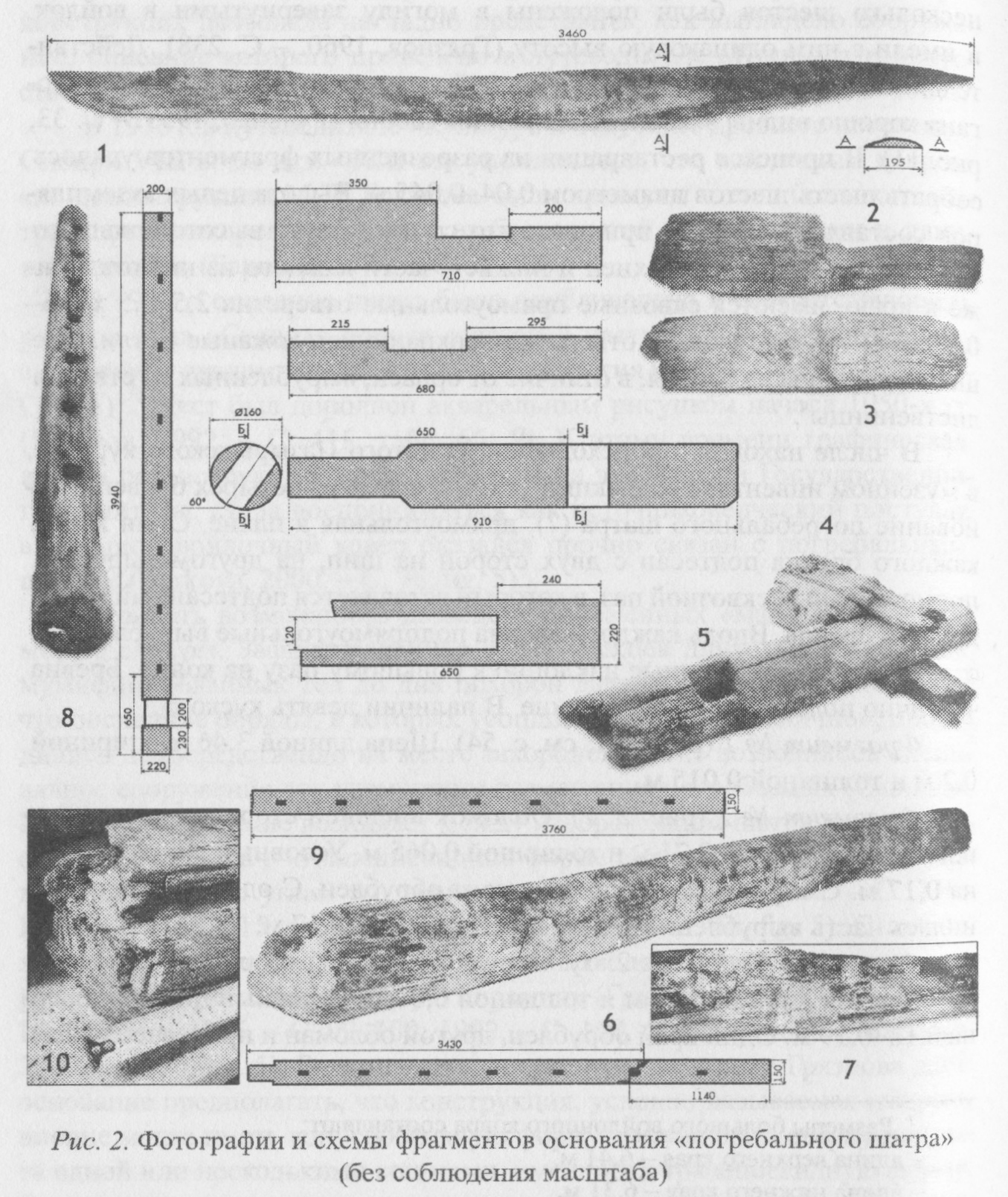 лента №9, торцевые стороны которого не имеют шипа или проушины. Каждый из фрагментов обгорел с одной стороны. Их суммарная длина составляет 4,67 м, что в принципе сопоставимо с длиной имеющегося в нашем распоряжении бревна, диаметр которого также равен 0,16 м. Возможно, частями одного бревна являются фрагменты под №4 и 8, диаметр которых составляет 0,22 м. Суммарная длина фрагментов — 4,55 м. Получается, что в отличие от прочих брёвен это имело сквозные отверстия для шипового соединения с двух краёв. Оставшиеся три фрагмента вполне могут быть обломками одного бревна, у которого с двух краёв были вырублены пазы. Тогда можно предположить, что основание сооружения собиралось следующим образом (рис. 3: 1). В бревно с двумя сквозными отверстиями на краях вставлялись бревна боковых сторон. Крепление осуществлялось при помощи шипов. Противоположные края укладывались в пазы бревна, замыкавшего четырёхугольник рамы.