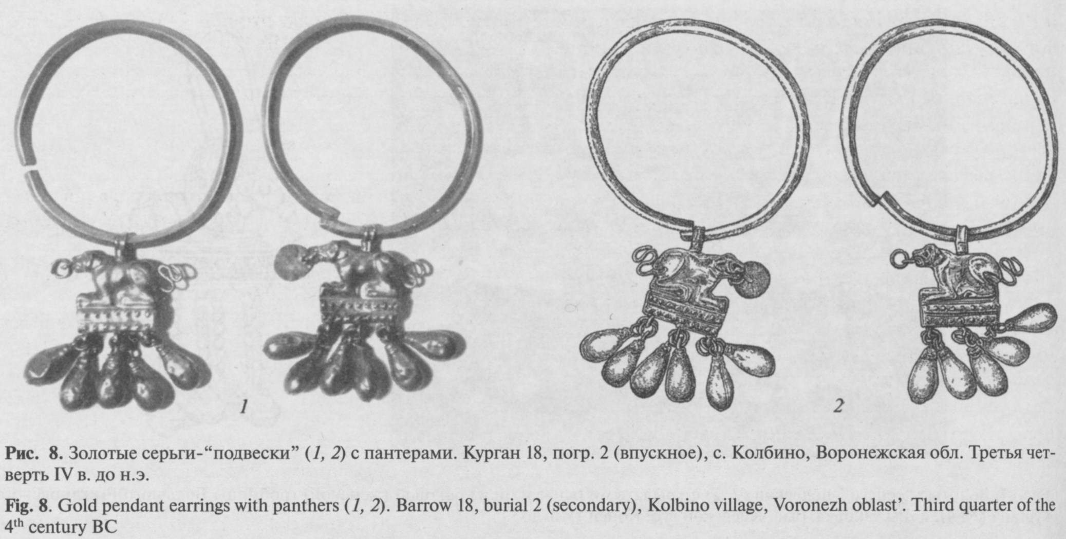 Рис. 8. Золотые серьги-«подвески» (1, 2) с пантерами. Курган 18, погр. 2 (впускное), с. Колбино, Воронежская обл. Третья четверть IV в. до н.э.