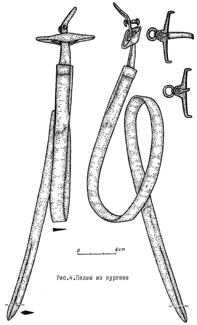 Подобные по составу находок и близкие по времени сооружения тайники обнаружены в курганах Черновая, к.12 [5] и Самохвал II., к. 1. [6] В составе инвентаря соян-сеёского кургана выделяется хорошо сохранившийся палаш. (Рис. 4). Он имеет прямой, однолезвийный клинок с обоюдоострым остриём. Длина клинка около 76 см, ширина — 2 см, длина обоюдоострого острия — 12 см. Клинок свёрнут в кольцо и согнут в двух местах. При подходе к рукояти клинок снабжён кольцевой обоймой и оковкой по лезвию, длиной 8 см. Черенок рукояти прямой, согнут в двух местах. На рукояти съёмное ладьевидное перекрестье, в черене отверстие, в котором находится шпенёк, расклёпанный с обоих концов, крепивший обкладку рукояти. Палаш хранился в ножнах, от которых после пребывания на погребальном костре сохранились обломки пластинчатых обойм, крепившихся с помощью заклёпок к скобам и кольцам для продевания ремней портупеи. Скобы имеют выступ, к которому крепятся концы пластин обойм. Внешний край скоб и выступов украшен насечкой.