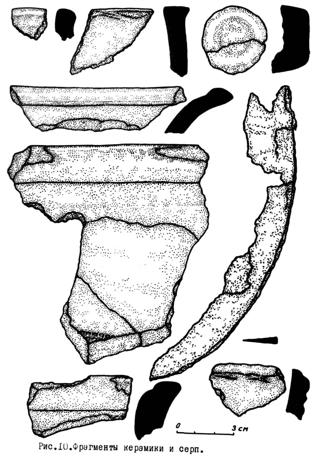 В Кургане № 3, более основательно ограбленном, обнаружены только фрагменты венчика и шейки кыргызской вазы с полосой штампованного орнамента, фрагменты лепных горшков с прямым или отогнутым венчиком, пряслице из стенки кыргызской вазы и железный серп. В сопроводительных захоронениях найдены фрагменты «кыргызской вазы» и лепных горшков. Не вполне ясно назначение керамического изделия в виде расширяющегося плоскодонного цилиндра. Вероятно это утолщённое дно или поддон небольшого сосуда (рис. 10).
