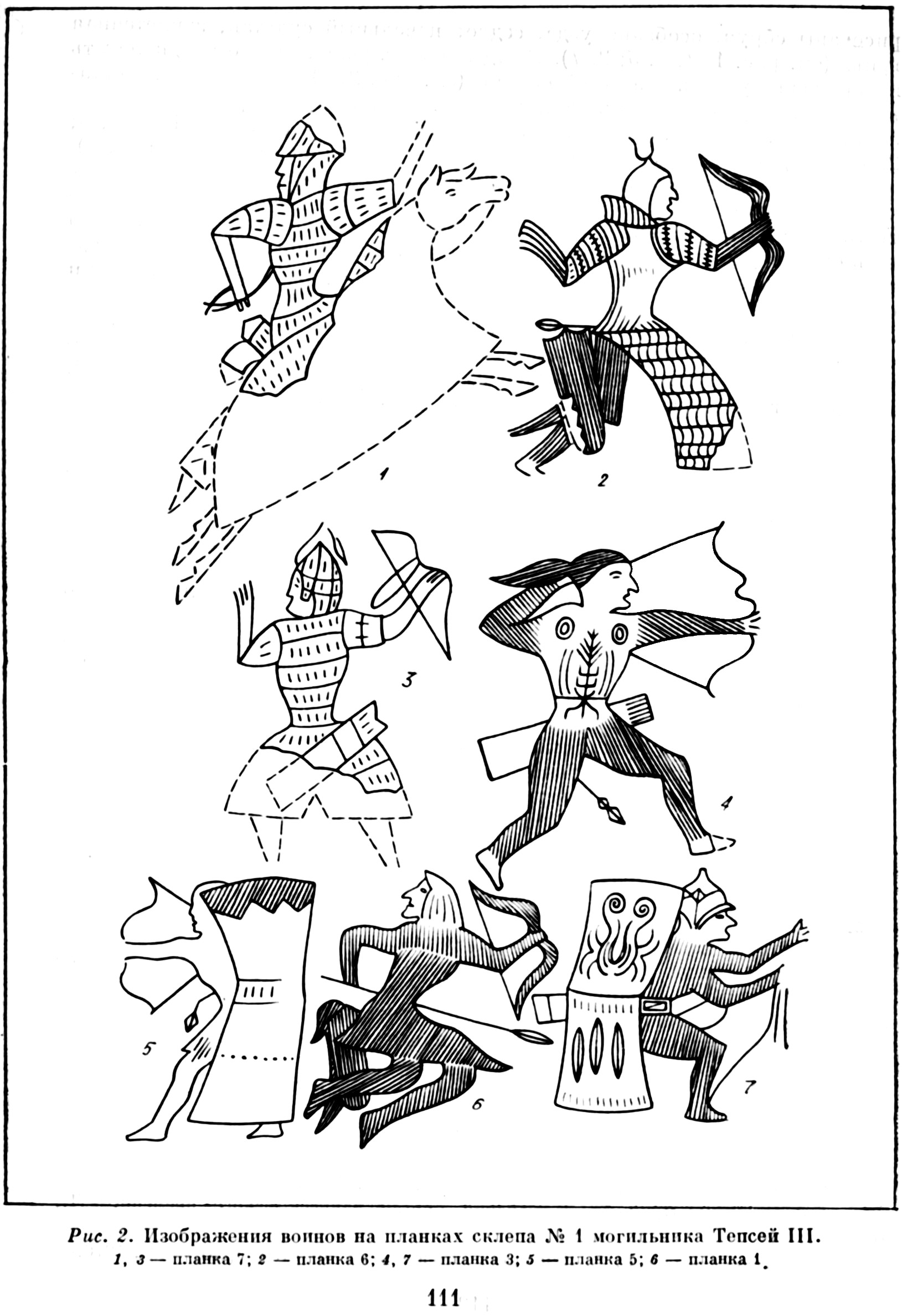 Рис. 2. Изображения воинов на планках склепа № 1 могильника Тепсей III. 1, 3 — планка 7; 2 — планка 6; 4, 7 — планка 3; 5 — планка 5; 6 — планка 1.