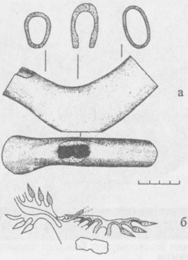 Погребение №15: а — предмет из рога; б — отверстие в основании предмета и орнаментальная гравировка.