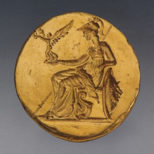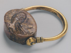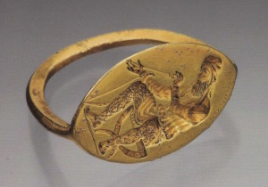 Кованый перстень с резьбой на щитке: стоящая Даная приподнимает подол хитона, ловя капли дождя. Скованность движения её фигуры, усиленная трактовкой складок одежды параллельными штрихами, позволяет отнести печать к произведениям строгого стиля.