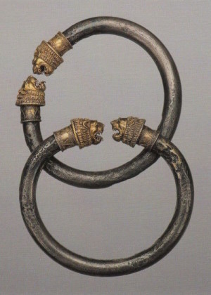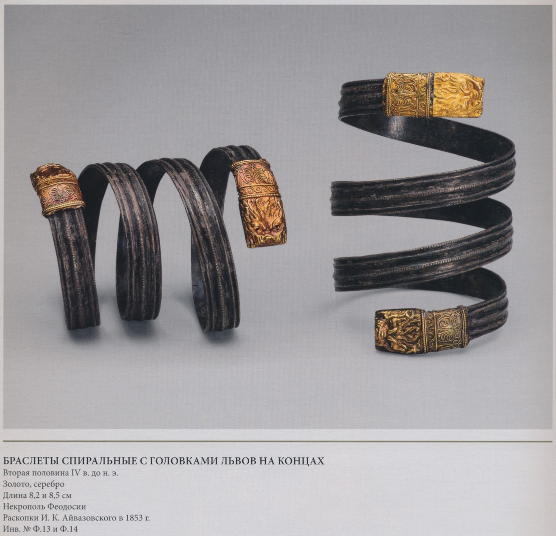 Пара браслетов из свёрнутой спиралью серебряной полосы, профилированной с внешней стороны и плоской с внутренней. Золотые окончания браслетов такого же вида, что и у шейного украшения с тесьмой (с. 210 [см. илл. на стр. 211]), декорированы с внешней стороны стилизованными львиными головами (часть львиной шкуры — атрибут Геракла, с. 116) с втулками, покрытыми филигранным узором из ряда пальметок, чередующихся с цветами лотоса и завитков, — распространённый в то время мотив. Эти браслеты — один из ранних примеров нового для Причерноморья вида украшений, ставших популярными в эпоху эллинизма (с. 194, 242).