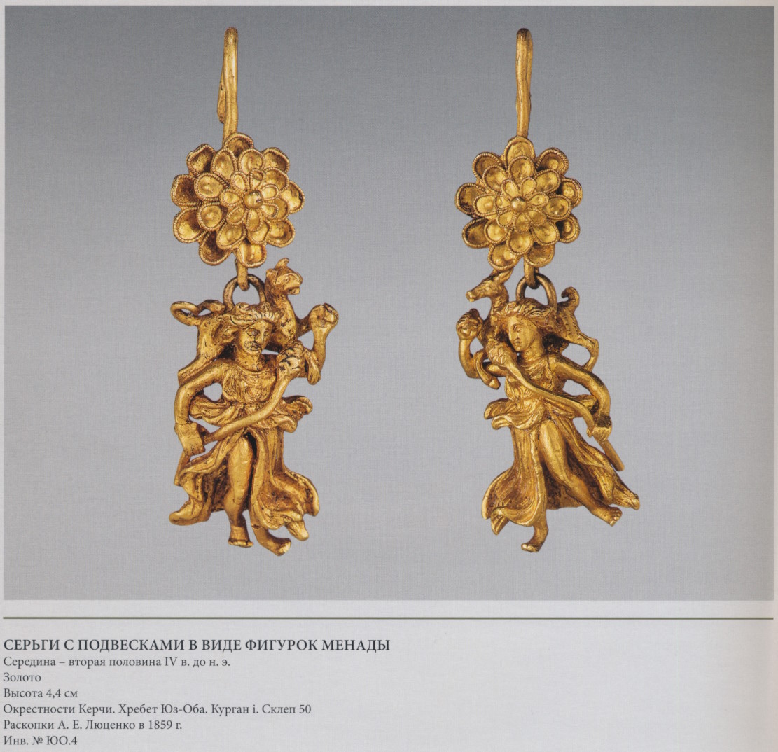 Серьги со щитком в форме трёхслойной филигранной розетки с шариком зерни в центре и подвеской в виде менады. Фигурки отлиты в разных формах, отдельно для левой и правой серьги. Менады, спутницы Диониса, кружатся в танце, зеркально повторяя движения друг друга. Каждая держит на плечах по животному, посвящённому Дионису: одна — пантеру, другая — лань. В руках у каждой тирс — жезл с еловой шишкой наверху — атрибут Диониса и его спутников. Быстрота движения подчёркнута развевающимися одеждами, изорванными в исступлённой пляске. Общего впечатления динамичности не нарушают некоторая небрежность литья и несоразмерность пропорций тел, впрочем незаметные без увеличения. Тирсы, животные, части одежды изготовлены отдельно и припаяны к готовым фигуркам. Черты лица, пряди волос, шерсть животных, чешуйки шишки на тирсе доработаны чеканкой.