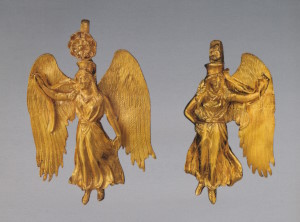 Вторая половина IV в. до н.э. Золото, серебро. Длина 8,2 и 8,5 см. Некрополь Феодосии. Раскопки И.К. Айвазовского в 1853 г. Инв. №Ф.13 и Ф.14.