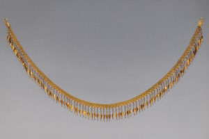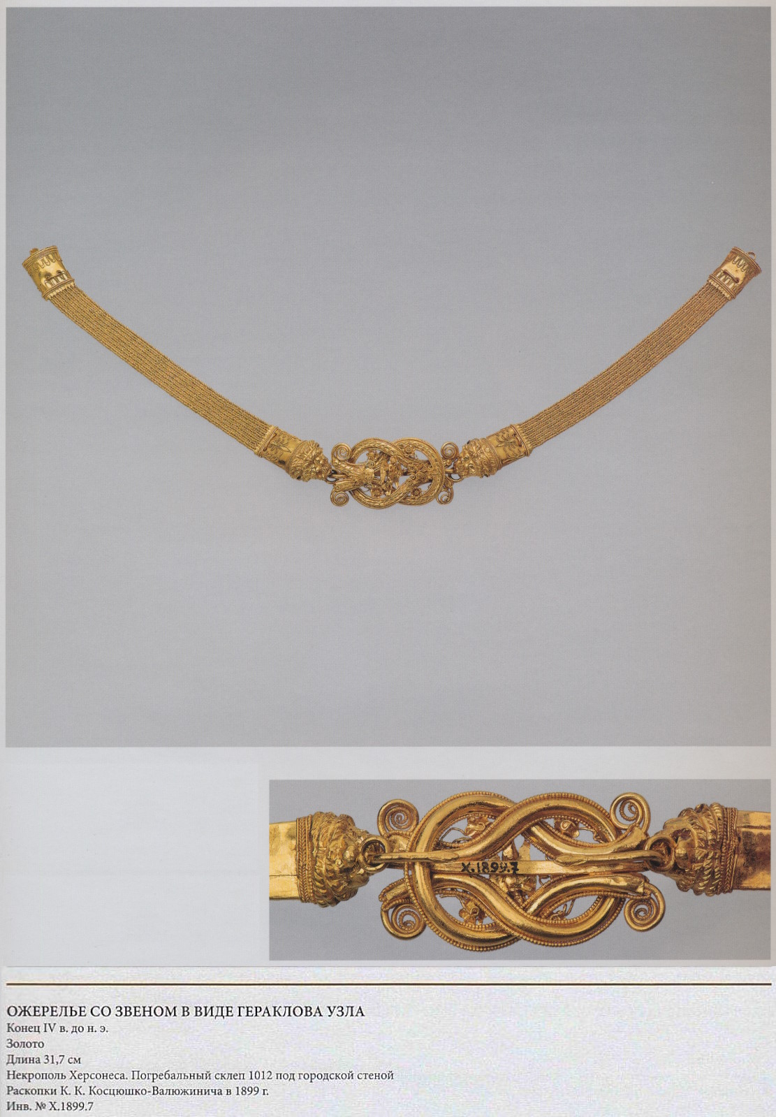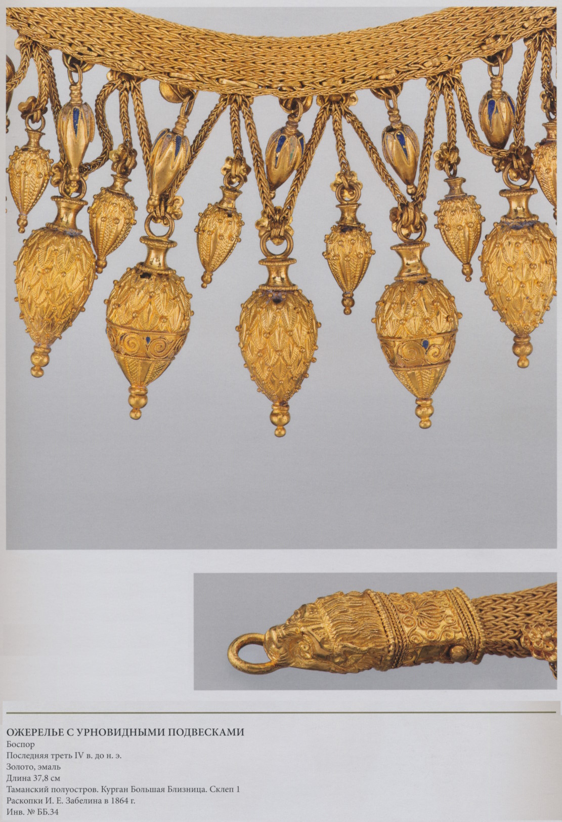 Ожерелье, нанизанное на две параллельные нити, как пронизи из Ольвии (с. 42), состоит из коробчатых пронизей, к которым присоединены зерновидные подвески (такие детали украшений можно рассматривать как символ благосостояния и плодовитости). Лицевая поверхность пронизей украшена дугами с волютами из зерни и филигранной розеткой с лепестками, заполненными синей и зелёной эмалью. Два звена с тиснёными пальметками служат окончаниями ожерелья.