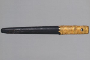 Сигаровидный стержень из тёмно-серого мелкозернистого камня, верхний конец которого вставлен в золотую оправу со сквозным отверстием для подвешивания. Оправа покрыта разнообразными узорами из филиграни и зерни. Её поверхность сильно потёрта от долгого ношения на поясе, фрагменты которого были найдены рядом. Это изделие, как и аналогичные ему предметы, в литературе обычно называли точилками (хотя следов работы на них нет) или пробирными камнями (Уильямс, Огден 1995). Подобные предметы, с декорированными или гладкими оправами, были найдены во многих скифских курганах в степях Северного Причерноморья, а более простые по устройству бруски с отверстием для подвешивания к поясу известны по многочисленным находкам скифского времени из Южной Сибири (Грязнов 1961. С. 142, 143). На поверхности всех этих камней есть потёртости от долгого ношения, что позволяет видеть в них хотя и не утилитарные, но тем не менее необходимые и ценные вещи, постоянно сопровождавшие владельца; скорее всего, это были амулеты (Алексеев 2012. С. 222). Вероятно, и входивший в состав поясно- (126/127) го набора данный камень с изысканной оправой можно считать ценным талисманом, а сильная изношенность золотой оправы позволяет видеть в нём постоянно носившуюся родовую инсигнию.