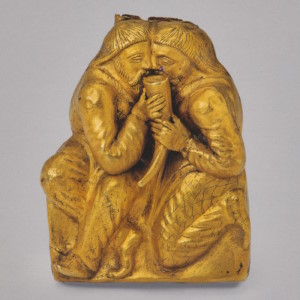 В высоком рельефе изображены два бородатых скифа, которые, тесно прижавшись друг к другу, держат, каждый одной рукой, рог, из которого собираются вместе пить. Они одеты в короткие отороченные мехом кафтаны с удлинёнными спереди (для удобства езды верхом) полами. Рельеф группы тиснёный, часть рук ниже плеч, а также рог изготовлены отдельно и припаяны. Пряди волос, опушка кафтанов и узор на одежде обозначены гравировкой. Обратная сторона рельефа прикрыта плоской пластинкой с широкой прямоугольной втулкой для крепления (с. 10).