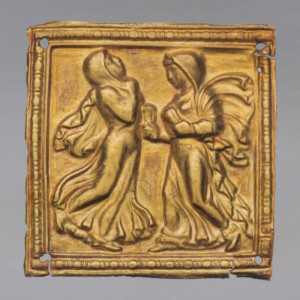 На рельефной бляшке изображены две закутанные в плащи женщины, кружащиеся в быстром танце, в руках одной из них кроталы — ударный музыкальный инструмент наподобие кастаньет. Всего найдено пять бляшек. Они вытиснены штампом столь чётко, что не потребовалось дополнительно дорабатывать «льющиеся» складки одежды танцовщиц. Одни исследователи считают их спутницами Диониса менадами (Копейкина 1986. С. 40, 41), другие — музами или харитами (Уильямс, Огден 1995. С. 150). Хариты, богини радости, часто выступали в поэзии как олицетворение юности. Афина, приближаясь к спальне Навсикаи, чтобы предсказать ей скорую свадьбу, увидела, что «подле порога дверей с двух сторон две служанки, харитам юным подобные, спали…» (Гомер. Одиссея, VI, 18, 19).