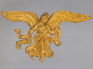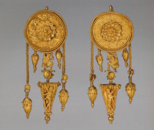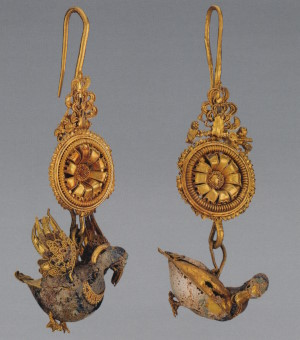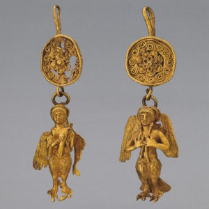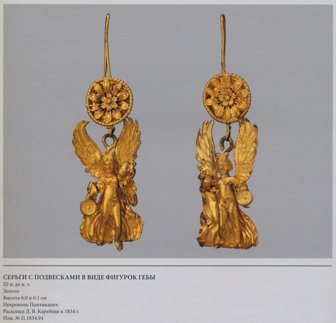 Пара серёг с дисками, украшенными розетками и филигранью, к которым подвешены фигурки крылатой Гебы с кувшином и фиалой в руках. Фигурки литые, руки с сосудами, крылья и плащ изготовлены отдельно. Геба, богиня юности, дочь Зевса и Геры, на пирах богов подносила нектар (до того как эти обязанности Зевс поручил похищенному им Ганимеду):
