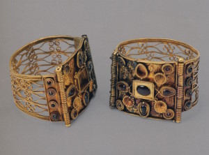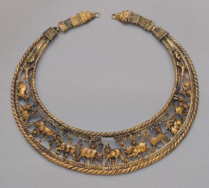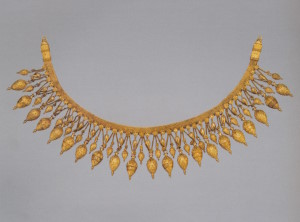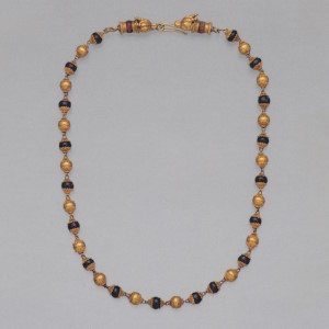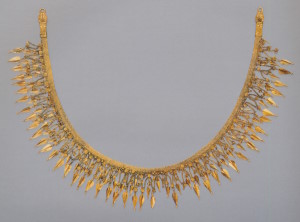 Центральную часть ожерелья составляют квадратный берилл и два овальных альмандина в оправах. Два отрезка золотого шнура из мелких колечек прикреплены к ним головками рысей на втулках из стеклянной пасты, имитирующей сардоникс. Застёжка, состоящая из крючка и петли, припаяна к гнёздам с альмандиновыми вставками в виде листьев плюща. Основной эффект производила яркая композиция из цветных камней в центре ожерелья, тогда как золоту отведена вспомогательная роль. Оправы камней и головок рысей соединены между собой шарнирами, оси которых украшены мелкими бусинами из альмандина и берилла. Ожерелья этого типа изготавливали и в первые века новой эры (с. 256, 258).