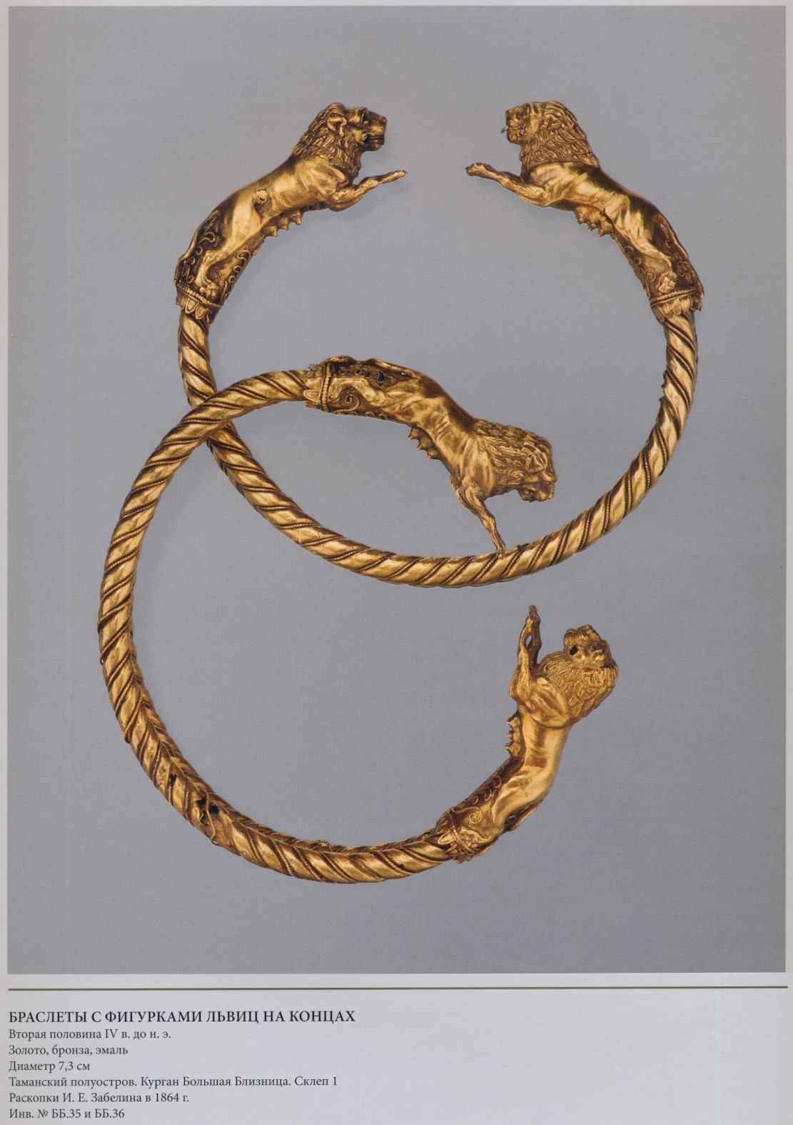 Два серебряных браслета с окончаниями в виде золотых львиных головок, спаянных из двух тисненых половинок. Детали рельефа доработаны чеканкой, втулки украшены филигранью и зернью. Зубы и языки были изготовлены отдельно и припаяны к готовым головкам. В глазу одного из львов сохранились следы киновари. На серебряной поверхности у втулок заметны слабые следы позолоты в виде остроугольных фестонов. Тип несомкнутого браслета с зооморфными окончаниями был заимствован греками из репертуара ближневосточного декоративного искусства и надолго стал излюбленной формой наручного украшения (с. 104, 122, 152, 172). Гармоничные пропорции и совершенство исполнения львиных голов ставят эти браслеты в ряд лучших украшений классической эпохи. Львиные головы на концах браслета могли служить оберегами: они как бы замыкали на запястиях магический круг, препятствуя возможному воздействию враждебных сил.