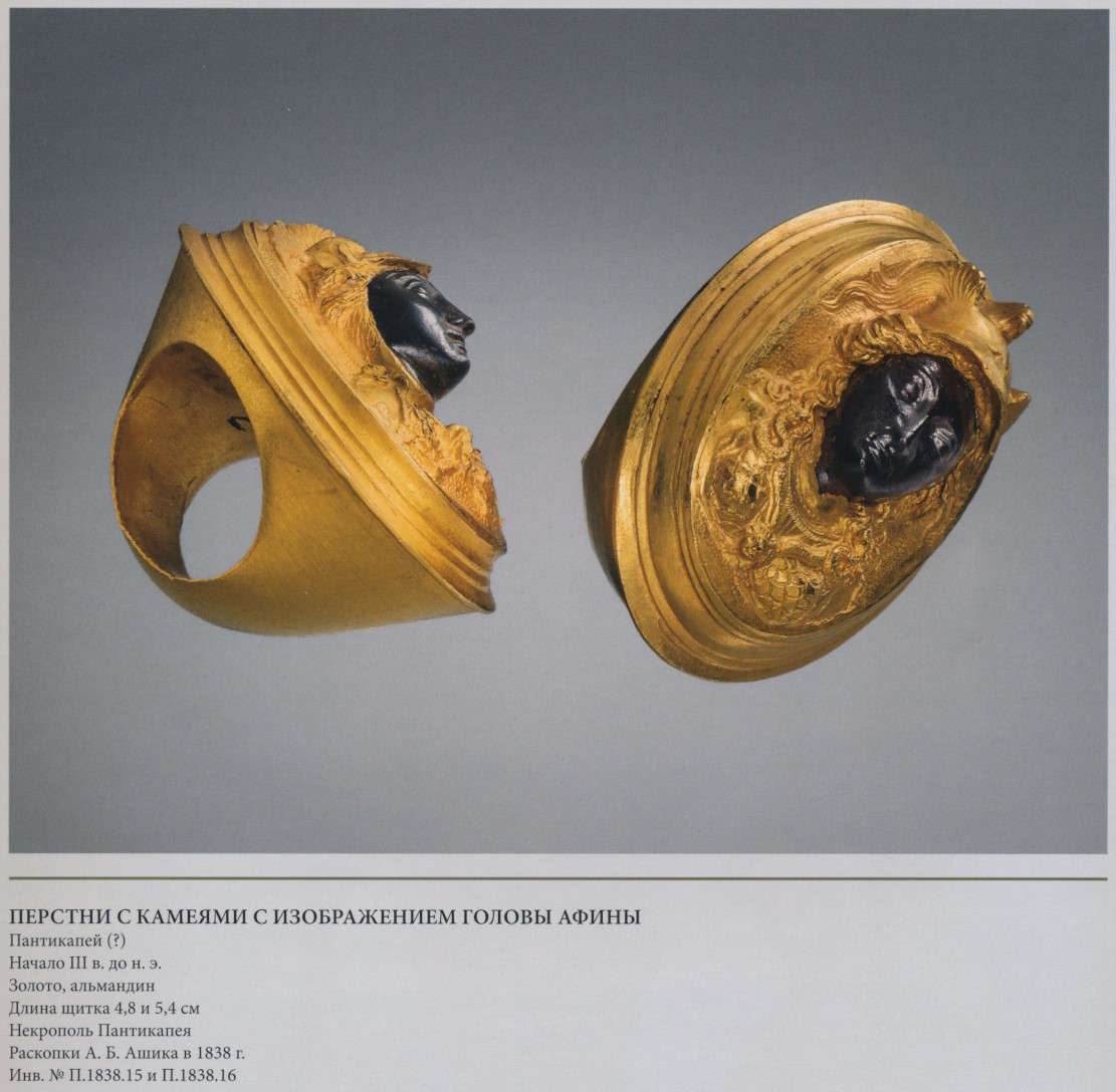 Дужка из двух проволок, украшенных филигранными полосками, завязана в центре геракловым узлом, в который вставлен альмандин. Гераклов узел, рассматривавшийся как магическое средство, часто включали в декор украшений (с. 210, 214, 220, 232, 250). Щиток, изготовленный в виде толстой подошвы сандалии, украшен по краю филигранью и зернью и заполнен стекловидной массой, кусочки которой вставлены между тонкими золотыми пластинками, образующими надпись: ECTIAIOC MAMMIAI — «Гестией (подарил) Маммии». Сопоставляя имена на перстне с именами боспорских надписей, М.И. Максимова признала весьма вероятным, что перстень сделан местным, скорее всего пантикапейским, мастером. Техника изготовления щитка очень близка к той, в которой исполнен медальон булавки (с. 254). Л.Э. Стефани, читая второе слово надписи как «матушка», комментировал форму щитка так: «Ввиду того общеизвестного употребления, какое греческие женщины обыкновенно делали из этой обуви не только по отношению к своим мужьям, но и главным образом при воспитании своих детей, перстень (248/249) подобной формы мог служить подарком, который сын подносил матери, желая, может быть, такою формою перстня напомнить ей о тщательном воспитании, данном ему, и таким образом выразить ей свою благодарность за это воспитание» (ОАК за 1880 г. С. 77, 78). Действительно, ввиду доступности такого средства воспитания, как сандалия, бывшего всегда под рукой, известный педагогический приём широко применяли не только среди людей, но и на Олимпе, где Афродита подобным образом вразумляла своего шустрого сына Эрота (Лукиан. Разговоры богов, XI, 1). В данном случае след ноги или отпечаток сандалии надо рассматривать скорее как знак присутствия божества, силы его воздействия и, следовательно, как доброе пожелание, аналогичное русскому «С богом!». В римскую эпоху исходя из таких же представлений след ступни оттискивали на дне краснолаковых чашек и тарелок, а золотые изображения отпечатков ступни служили приношениями в храм.