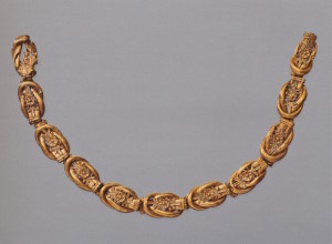 Двухрядное ожерелье (все золотые пронизи имеют по две петельки с обратной стороны, а лигнитовые — по два сквозных отверстия) составлено из одиннадцати золотых трёхчастных и тринадцати лигнитовых ромбических пронизей. В трёхчастных пронизях треугольники с филигранными розетками, а квадраты — с изображениями человеческих голов, розетками, зернью и её имитацией (с. 228). Пространство между пронизями заполнено мелкими золотыми и биконическими бусинами. Чередование матовых золотых и чёрных лигнитовых элементов довольно эффектно и необычно для времени, когда в украшениях царили яркие цвета.