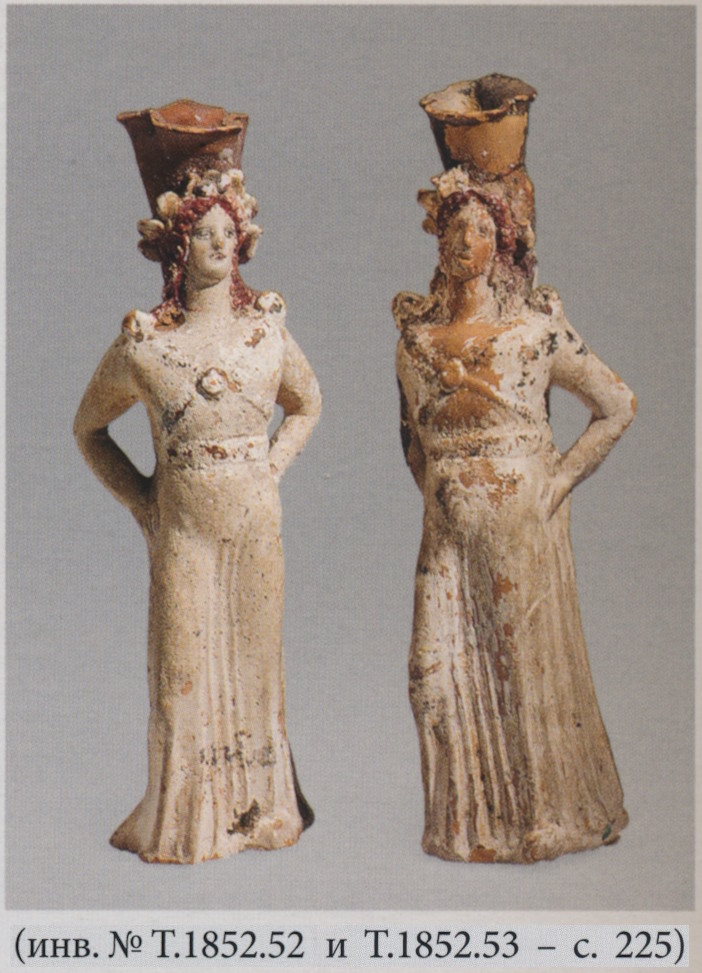 Геракл, взятый после смерти на Олимп, стал её супругом (Гомер. Одиссея, XI, 600; Гесиод. О происхождении богов, 950). Гебу иногда изображали крылатой. Среди эллинских богинь крылатыми были вестница богов Ирида, олицетворение утренней зари Эос и богиня победы Ника. В данном случае кувшин и фиала красноречиво свидетельствуют в пользу Гебы. Серьги найдены вместе с медальоном (с. 226).