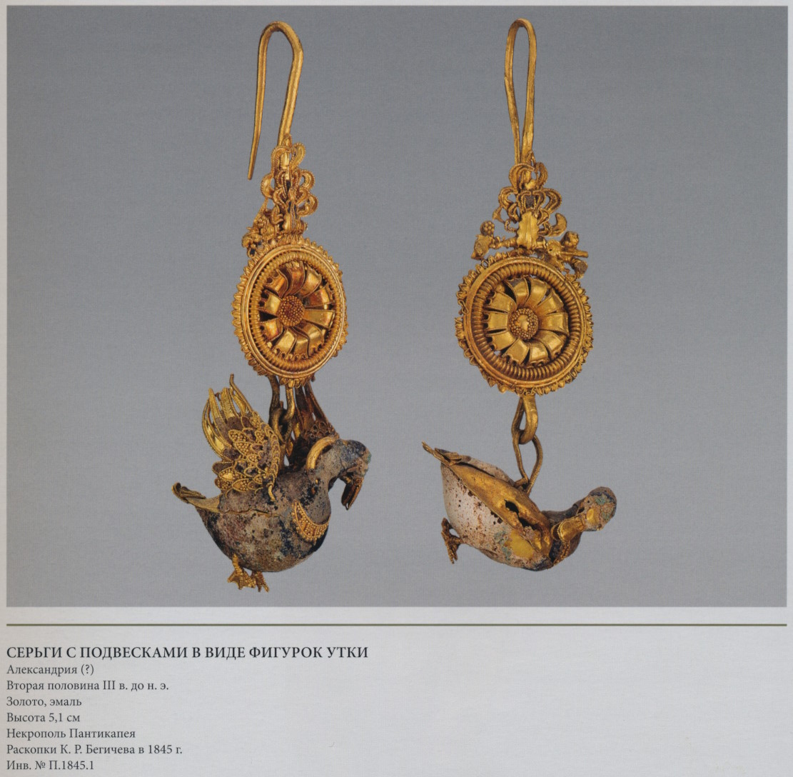 Зеркально симметричные фигурки летящего Эрота подвешены к дискам, украшенным филигранью. Фигурки литые; крылья, плащи, руки, кувшины изготовлены отдельно и припаяны к туловищу. Их художественный уровень, конечно, несопоставим с такими произведениями миниатюрной скульптуры, как Артемида верхом на лани (с. 68) или Ника (с. 112), но тем не менее серьги интересны как пример типичного для эпохи эллинизма украшения. По предположению М.И. Максимовой, подобной фигуркой мастер заменил во время ремонта диадемы (с. 250) пропавшую фигурку Ганимеда (Максимова 1979. С. 48). Этот сюжет повторялся во множестве вариантов, где у Эрота в руках вместо лука предметы, относящиеся к развлечениям: музыкальные инструменты, театральная маска, чаша, кувшин, венок для пирующих, что делало его олицетворением любви и сопутствующих ей удовольствий. Такую роль Эрота обыгрывали в изобразительном искусстве и в литературе, как, например, в эпиграмме.