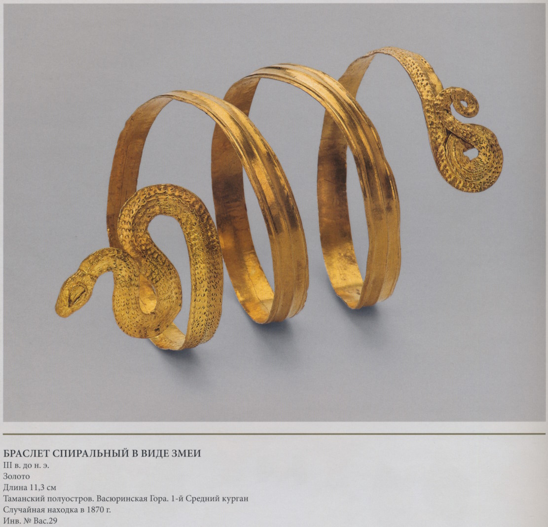 Браслет из шнура с головками змей на концах. Шнур составлен из соединённых вместе цепочек со звеньями двойного переплетения. Головы змей литые, с глазами и чешуёй, проработанными чеканкой. Окончания браслета снабжены застёжкой из пары колечек и крючков, в свою очередь оканчивающихся миниатюрными головками змей. Изображение змеи во все времена считалось действенным амулетом. В Афинах такими амулетами охраняли детей (Еврипид. Ион, 24-26, 1427-1431).