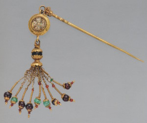 Профилированная в верхней части игла завершается головкой в виде ажурной капители, к которой прикреплён круглый медальон с кистью подвесок-бусин на цепочках. Поле медальона заполнено розеткой, изготовленной способом, напоминающим возникшую гораздо позднее технику перегородчатой эмали: из припаянных вертикально к основе медальона полосок золота составлен контур розетки, заполненный стеклянной пастой зелёного, белого и коричневого цветов. К медальону подвешена бусина в оправе, которая и удерживает кисть из подвесок, такую же, как и на диадеме (с. 250), но с включением бусин из берилла и сердолика.