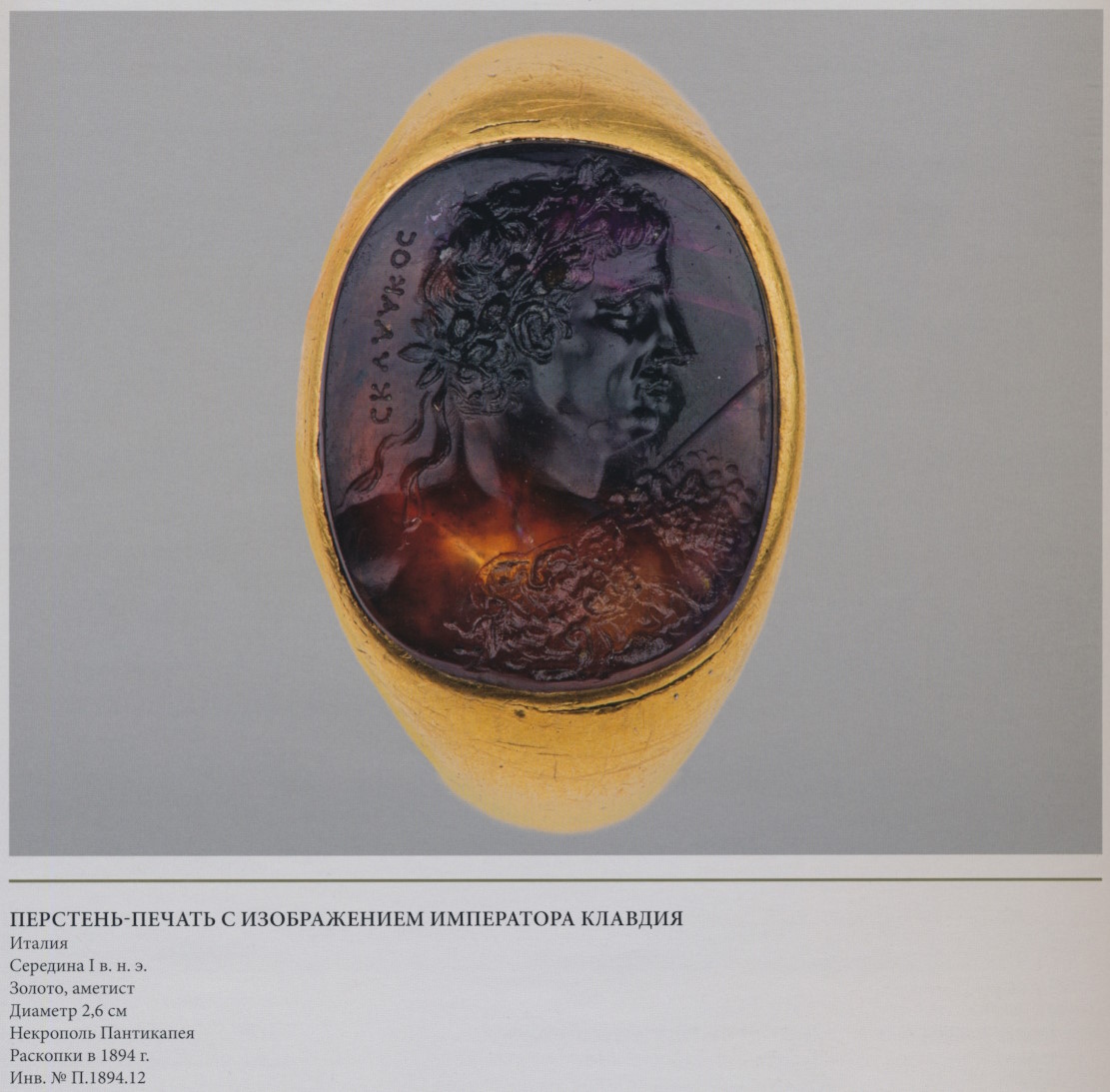 Овальный выпуклый аметист вставлен в полый перстень, спаянный из двух частей, внутренней плоской и наружной выпуклой. Для сохранения формы внутрь таких перстней, распространённых в первые века новой эры, вводили специальную мастику. На камне вырезано изображение римского императора Клавдия в лавровом венке, с копьём; на нём доспех с украшением в центре. Эти атрибуты победителя служили намёком на военные успехи, хотя сам он был человеком мирным и писал исторические сочинения, не дошедшие до нас (Светоний. Клавдий, 41, 42). На гемме — имя италийского резчика: CΚΥΛΑΚΟC (Скилака), вырезанное справа налево, что обычно для печатей. Мастер воспроизвёл образ надменного правителя, его отсутствующий взгляд и презрительно сложенные губы. При Клавдии римские войска подавили попытки боспорского царя Митридата VIII стать независимым от Рима правителем (Тацит. Анналы, XII, 12-20). Перстень принадлежал кому-либо из римских военнослужащих или был подарен боспорскому стороннику римлян.