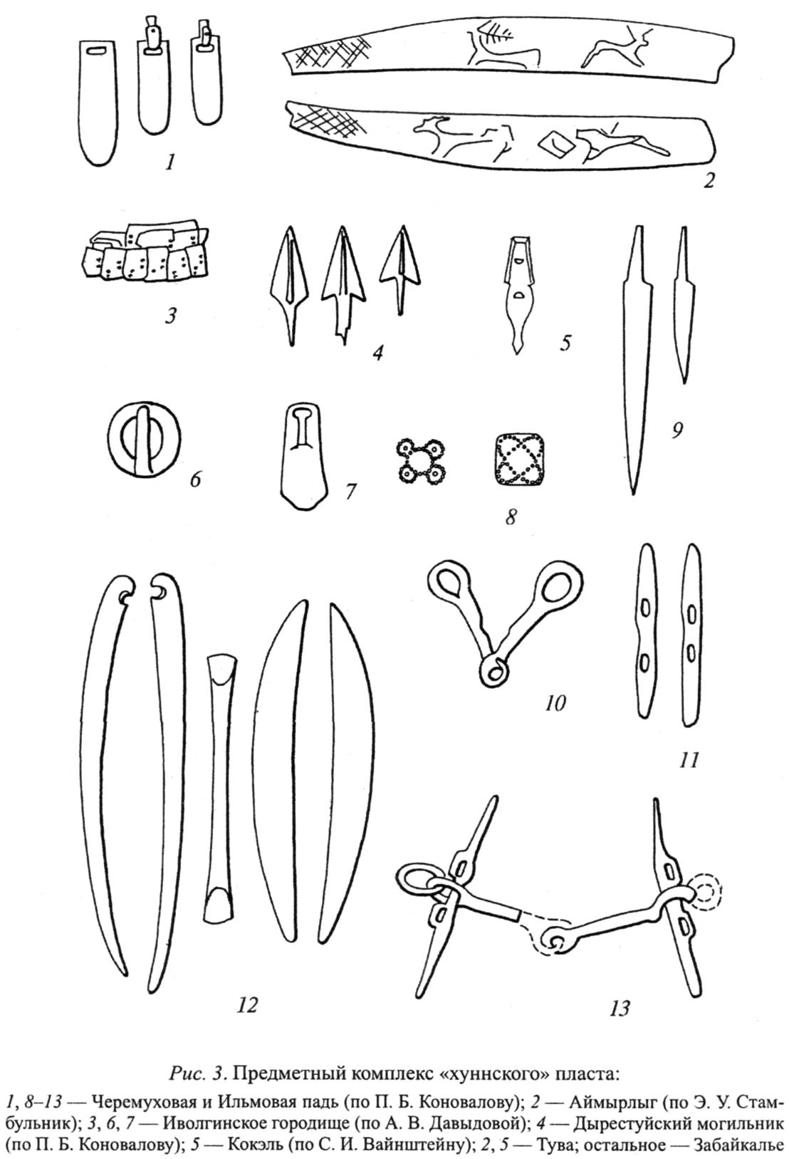 1, 8-13 — Черёмуховая и Ильмовая падь (по П.Б. Коновалову); 2 — Аймырлыг (по Э.У. Стамбульник); 3, 6, 7 — Иволгинское городище (по А.В. Давыдовой); 4 — Дырестуйский могильник (по П.Б. Коновалову); 5 — Кокэль (по С.И. Вайнштейну); 2, 5 — Тува; остальное — Забайкалье.