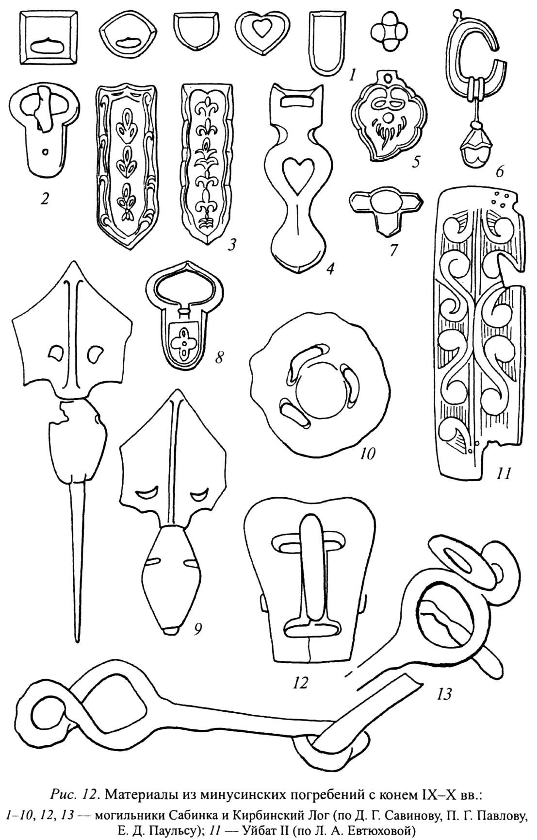 1-10, 12, 13 — могильники Сабинка и Кирбинский Лог (по Д.Г. Савинову, П.Г. Павлову, Е.Д. Паульсу); 11 — Уйбат II (по Л.А. Евтюховой).