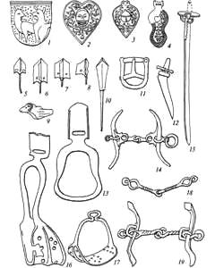 1 — Семипалатинск (по А.А. Спицыну); 2 — Когалы (по З.С. Самашеву, Н.А. Боковенко); 3, 6, 7 — Юпитер (раскопки С.С. Черникова); 4 — Пчела (раскопки С.С. Черникова); 5, 21 — Орловский могильник (по Ф.X. Арслановой); 8, 13 — Зевакино (по Ф.X. Арслановой, С.Г. Кляшторному); 9, 10 — Кызыл-Ту (раскопки С.С. Черникова); 10-12, 14, 19, 20 — Славянка (раскопки С.С. Черникова); 15-18 — наконечники стрел из раскопок С.С. Черникова (по Ю.С. Худякову).