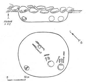 Вторая курганная группа находилась метров на 100 ближе к посёлку рудника, чем первая. Она состояла из 22 также компактно расположенных плоских каменных курганчиков, которые и были раскопаны нами в 1935-1936 гг. Размеры насыпей колебались от 1,4 до 4,5 м в диаметре, не превышая 0,35 м над уровнем современной поверхности и 0,5 м над линией древнего горизонта. Почти все они имеют форму круглых дисков, выложенных камнем, более плотно по краю окружности и в центре. Только две насыпи были овальные (см. прилагаемую таблицу), под каждой насыпью обнаружено по одной могильной яме овальной формы, вытянутой с запада на восток, большей частью с отклонениями. Только под тремя курганами, из которых два содержали трупосожжения на горизонте, а в третьем совсем не оказалось погребения, могильных ям не было. Как правило, покойников хоронили по обряду трупоположения и клали в вытянутом положении на спину. Только в трёх случаях встретились трупосожжения, и в одном — скорченное погребение на правом боку. В могиле обычно захоронено по одному человеку и очень часто с конём, реже с бараном. Только один раз встретилось погребение двух человек в одной могиле, без сопровождающих их животных. Ориентировка погребений была неустойчивой, но костяки животных обычно ориентированы в ту же сторону, что и покойник, лишь в двух случаях (курганы № 8 и 13) костяк человека и костяк коня лежали головами в противоположные стороны (рис. 6, 1, 3). При этом в обоих случаях, тоже как исключение, покойники были похоронены в берестяных гробах вытянуто на спине. Лишь в одной могиле (курган 18) обнаружено погребение женщины с железной пряжкой у пояса, на правом боку в скорченном положении. Почти все покойники были положены на дно могилы без гробов и подстилок, но головы у них обычно, несколько приподняты — возможно, они лежали на подушках; в двух случаях под череп были подложены каменные плитки. Иногда костяки коней лежали как бы на уступах дна могилы (рис. 6, 3), несколько выше, чем скелет человека. [18]