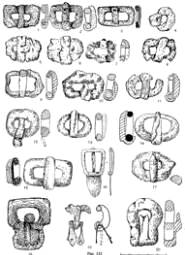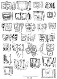 Рис. 126. Наременные бронзовые пряжки из курганов №№ : 1-3 — 9; 4-6 — 68; 7 — 313; 8 — 11; 9, 18 — 304; 10 — 243; 11 — 206; 12 — 5; 13 — 248; 14 — 247; 15 — 76\2; 16-17 — 394; №№ 9, 5, 11 мог. Косасар 3; №№ 68, 76\2 мог. Алтынасар 4б; № 206 — мог. Алтынасар 4п; №№ 304, 313 — мог. Алтынасар 4о; №№ 243, 247, 248 — мог. Алтынасар 4л; № 394 — мог. Алтынасар 4р. |