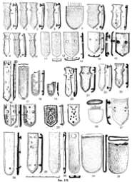 Рис. 89. Костяные накладки сложного лука из курганов №№ : 1-4 — 18; 5-9 — 34; 10-15 — 293; 16-23 — 165; 24-30 — 70; 31-33 — 98; 34 — 249. № 18 — мог. Косасар 2, № 34 — мог. Алтынасар 4а, № 293 — мог. Алтынасар 4о, № 165 — мог. Алтынасар 4ж, №№ 70, 98 — мог. Алтынасар 4в, № 249 — мог. Алтынасар 4л. |