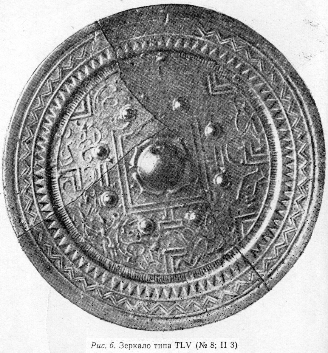8 (II 3) ^ Зеркало типа TLV Красноярский краевой краеведческий музей, №164-6 (рис. 6) Круглое, с массивной шишкой-петлёй в центре. От шишки отходят четыре лепестка. В центре орнаментального поля помещен квадратный ободок из двойных линий, от сторон которого отходят Т-образные фигуры с шишечками по бокам. Орнаментальное поле занято изображениями реально существующих и фантастических животных и птиц среди завитков, L- и V-образных фигур. По краю лента из параллельных линий, две ленты из зубчиков и узкий ровный бортик. Зеркало разбито на три куска. Орнамент полустёрт. Белый металл. I в. н.э. Д — 14,8 см. Место находки: Минусинская котловина. Издание: А. Ермолаев, Ишимская коллекция, табл. III, 8. Аналогии: Тё:сэн косэки дзуфу, №3790; Лоян чуту тун цзин, №79.