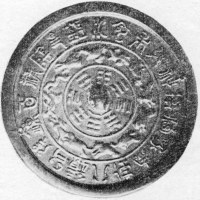 20 (III 2) ^ Зеркало с изображением багуа и животных зодиака. Красноярский краевой краеведческий музей, №146-8 (рис. 13) Круглое, с шишкой-петлёй в центре. Орнамент зеркала образован тремя поясами, разделёнными ободками. Внутрен- ний пояс, расположенный вокруг шишки, окружённой восьмигранным бортиком, состоит из восьми триграмм багуа. В центральном поясе помещены двенадцать животных зодиака. В наружном поле находится надпись из 20 архаически написанных иероглифов: шуй инь чэн инь цзин, бай лянь дэ вэй цзинь, ба гуа шоу сян бэй, вэй шэнь юн бао мин. По краю широкий ровный бортик. Тёмная патина. Первая половина Тан (VII-VIII вв.). Д — 21 см. Место находки: Минусинская котловина. Издание: Э. Pыгдылон, Китайские знаки и надписи, стр. 119. Аналогии: Яньку, т. 3, №114; М. Rupert, О. Тоdd, Chinese bronze mirrors, №351. Перевод надписи: «Ртуть выявляет сущность [символа] инь. Металл, выплавленный сто раз, пригоден для изготовления зеркала. Восемь триграмм багуа содержат в себе все признаки долголетия. Охраняющее божество всегда охранит предназначение».
