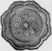 76 (III 19A) ^ Фрагмент зеркала Минусинский музей, №5142 (рис. 32) Фрагмент восьмилопастного зеркала с изображением шестилепестковых цветов водяного каштана — лин. В цветке — кольцо, составленное из тычинок и шесть шишечек, помещённых вокруг седьмой. Цветы водяного каштана чередуются с шестилепестковыми цветами сычуаньской мальвы — шукуй. На краю фрагмента сохранилась часть лопастной розетки, окружавшей центральную шишку-петлю. Неширокий ровный бортик. Белый металл. Период Тан (VII-IX вв.). Место находки: Минусинская котловина. Шестилопастные зеркала с орнаментом из шести чередующихся цветочных розеток в танскую эпоху были распространены достаточно широко. Ближайшая аналогия: Ван Ши-лунь, Чжэцзян чуту тун цзин цюаньцзи, №52.