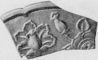 31 (III 4Д) ^ Аналогия №22 Государственный Исторический музей, №39165 Фрагмент. Сохранилась часть наружного поля орнамента с изображением иволги среди виноградных и гранатовых завитков. Бордюр — пальметки. Белый металл. Место находки: Минусинская котловина.
