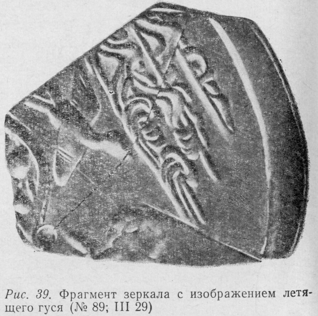 89 (III 29) ^ Фрагмент зеркала Минусинский музей, №5148 (рис. 39) Фрагмент круглого зеркала с сохранившимся изображением летящего гуся среди стилизованных облаков и цветка. В углу фрагмента отверстие. Белый металл. Период Тан (VIII-IX вв.). Место находки: дер. Монок.