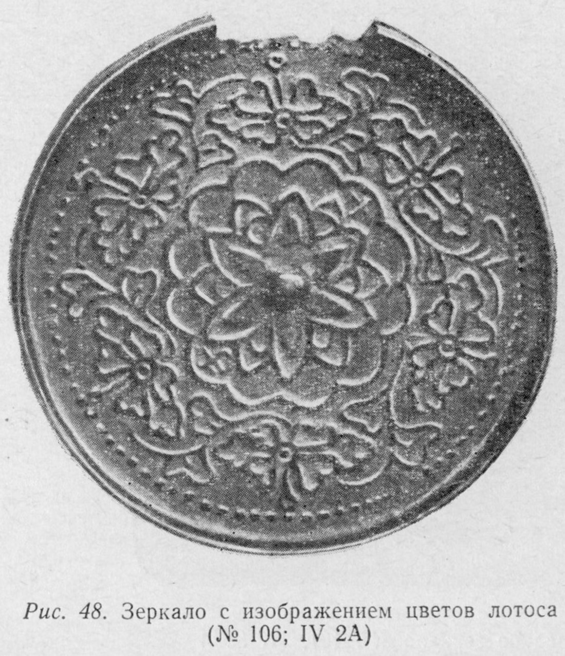 28 (III 4B) ^ Аналогия №22 Иркутский областной краеведческий музей Зеркало не сохранилось. Описание даётся по рисунку. Круглое, с массивной шишкой-петлёй в виде льва в центре. Во внутреннем поле орнамента среди виноградных завитков помещены четыре льва, бегущих по часовой стрелке. Во внешнем поле, отделённом ободком, летящие иволги среди виноградных и гранатовых завитков. Начало Тан (VII в.). Д — 9,2 см. Место находки: Минусинская котловина. Аналогия: Яньку, т. 3, №27.