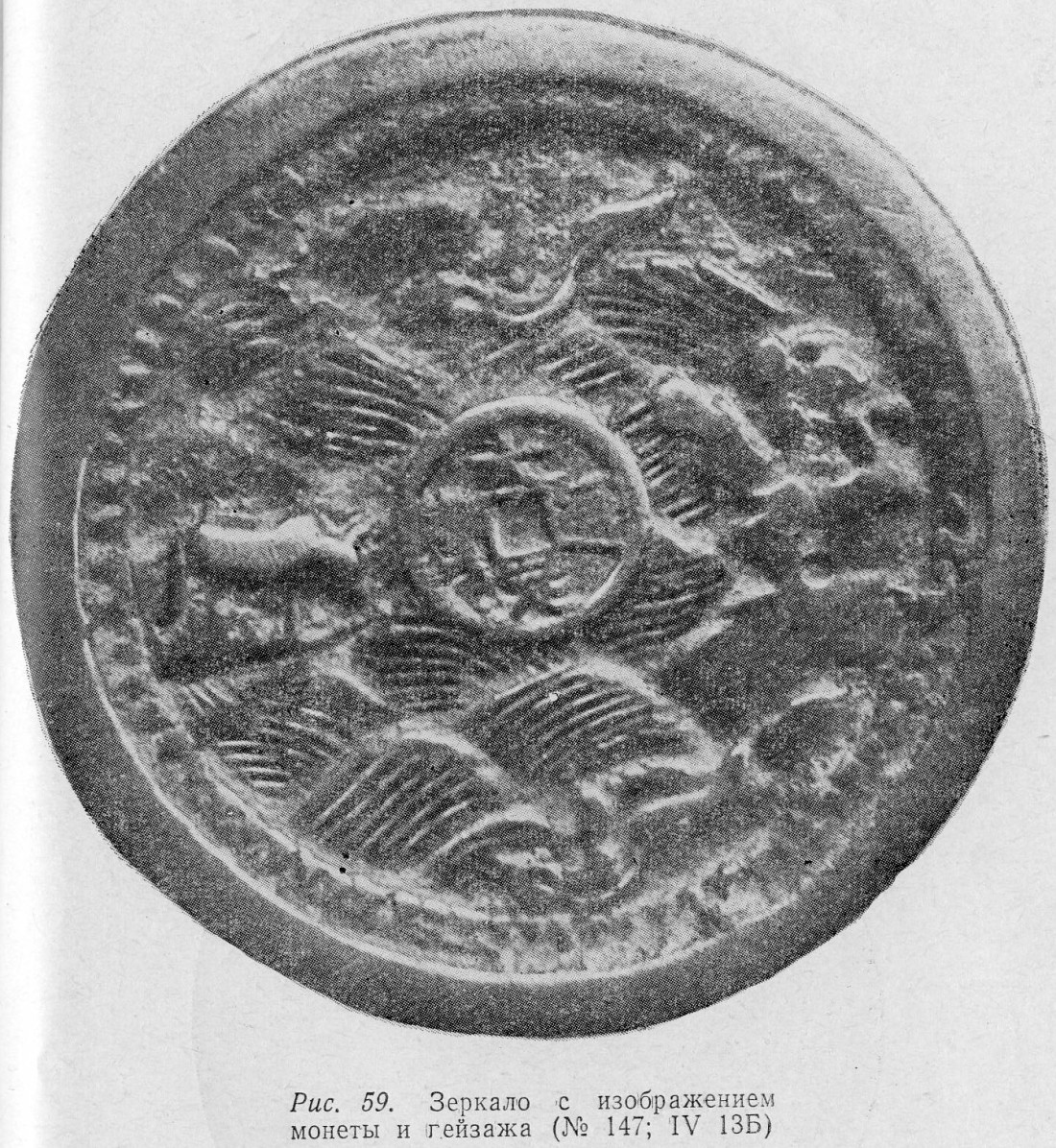 59 (III 7) ^ Зеркало с изображением львов и надписью Государственный Эрмитаж, №8347-19 (рис. 21) Круглое, с шишкой-петлёй в центре, окружённой двойным бортиком. Внутреннее поле орнамента заполнено изображением четырёх бегущих львов, разделенных стилизованными виноградными побегами. Во внешнем поле, отделённом ободком, находится надпись: шан дэ цинь ван цзинь, кань бу си цянь цзинь, фэй гуань юань чжао дань, чи ши цзы мин дань. По краю высокий двойной бортик с желобком. Белый металл. Период Тан (VIII-IX вв.). Д — 9 см. Место находки: Мунгун-тайга. Издание: А.Д. Гpач, Древнетюркское погребение с зеркалом Цинь-вана в Туве. Аналогии: Яньку, т. 3, №22, 23; Фын Юнь-пэн, Цзинь ши со, т. XII. Перевод надписи: «С радостью я приобрету зеркало Цинь-вана, за которое не пожалею никаких денег. Моё желание, чтобы зеркало служило не для выявления желчного пузыря (т.е. злых мыслей. — Е.Л.-Л.), а для того, чтобы я смог постичь своё сердце». Различные варианты перевода см.: М. Rupert, О. Тоdd, Chinese bronse mirrors, стр. 140; R.W. Swallow, Ancient Chinese bronze Mirrors, табл. 31; P.Ф. Итс, О надписи на китайском зеркале из Тувы. Надпись на зеркале имеет связь с легендой, содержащейся в книге «Рассказы о Западной столице», датируемой первыми веками нашей эры. В «Рассказах» говорится, что «в дворце циньского императора в Сяньяне находилось большое квадратное зеркало, с обеих сторон испускавшее сияние. Когда человек шёл смотреться в него, то его изображение казалось перевёрнутым. Если кто-нибудь подходил, держа руку на сердце, то он мог видеть свои внутренние органы. Если человек имел скрытую болезнь, то ему было достаточно посмотреться в зеркало, чтобы узнать причину болезни. А если у женщины были злые намерения, то её желчь разливалась и сердце начинало волноваться. Цинь Ши Хуан-ди постоянно пользовался этим зеркалом, заставляя смотреться в него женщин своего гарема. Тех, у кого была разлитая желчь и взволнованное сердце, он убивал» (Си цзин цза цзи, цз. III).