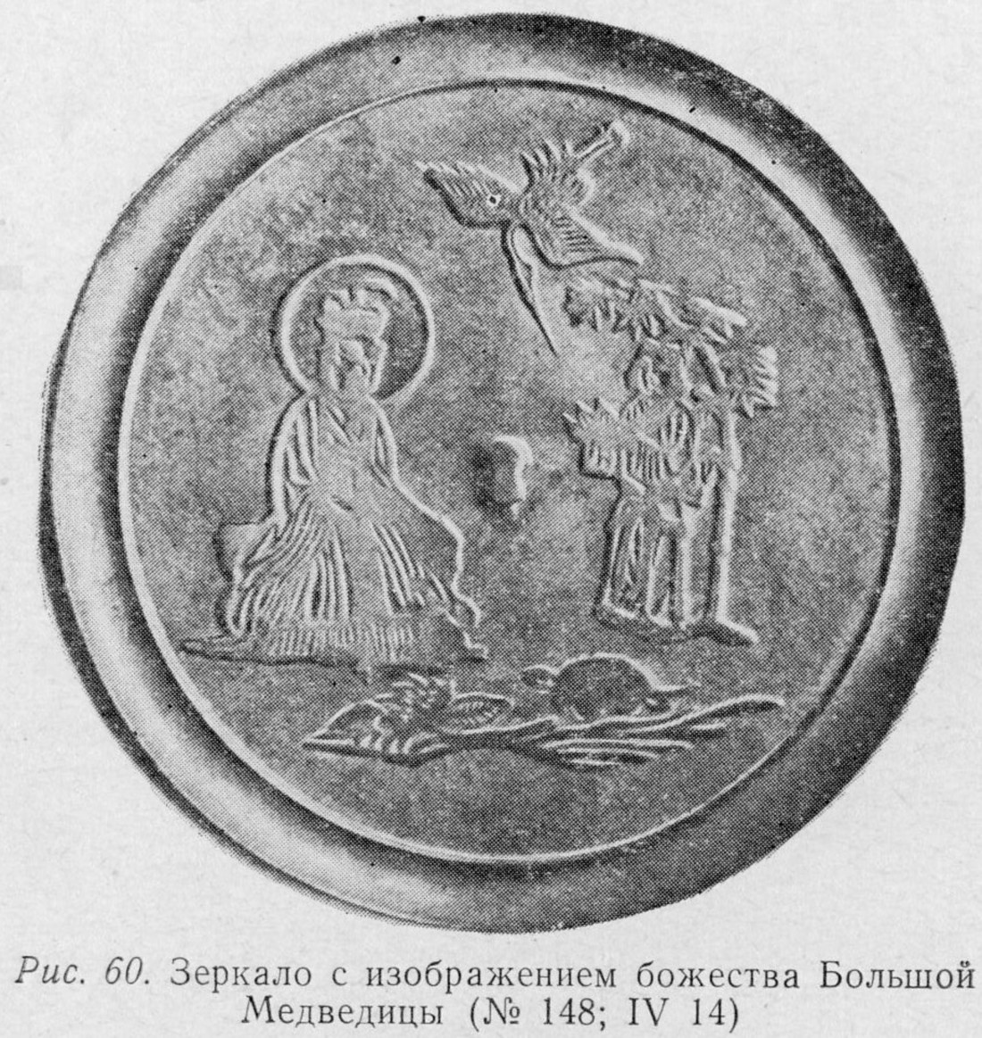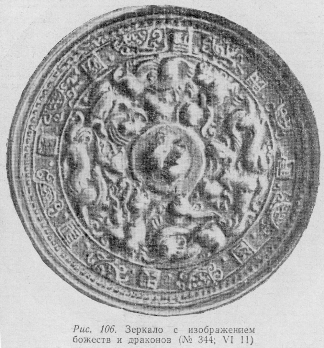 343 (VI 10) ^ Зеркало с изображением божеств Минусинский музей, №5180 (рис. 105) Круглое, с массивной шишкой-петлёй в центре, окружённой круглым основанием с четырьмя ободками. Орнаментальное поле занято изображениями в рельефе двух противостоящих божеств со слугами по бокам. Между ними помещены тигр и дракон. Изображения разделены шишечками с круглым основанием и кольцом из точек. Орнаментальное поле окружено лентой, заполненной иероглифами: Юань ши цзо цзин чжэн да си дун ван гун си ван му цин лун цзай цзо бай ху цзюй ю сян жэнь цзы гао чи сунь цзы цянь цю вань суй бу чжи ляо хэ цы юй цюань цзи ши цзао. По краю — лента из параллельных чёрточек, три зубчатые ленты и высокий острый бортик. Жёлтый металл с тёмной патиной. Копия XII-XIV вв. зеркала III в. н.э. Д — 18,2 см. Место находки: Усть-Есь. Перевод надписи: «Господин Юань сделал зеркало. Оно поистине сделано умело. Дунвангун, Сиванму и Зелёный дракон находятся слева, Белый тигр пребывает справа. Бессмертны — Сян Цзы-гао и Чи Сун-цзы в течение тысячи осеней и десяти тысяч лет не знают старости. Когда у них жажда, они пьют из яшмовых источников; когда — голод, они едят жужубы» (см. В. Karlgren, Early Chinese mirror inscriptions, №215, №229).