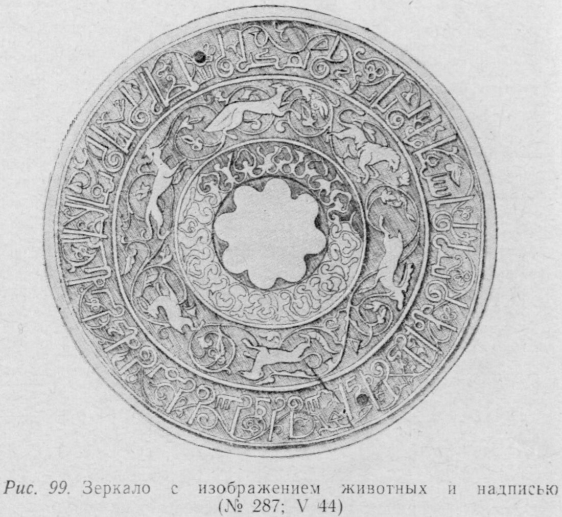 287 (V 44) ^ Зеркало с изображением животных и надписью Коллекция Мессершмидта (рис. 99) Круглое, с шишкой-петлёй в центре. Шишка окружена восьмилопастной розеткой. Орнаментальное поле занято тремя поясами, разделёнными ободками. Внутренний пояс заполнен стилизованными цветочными формами. В центральном поясе помещены бегущие животные: лев, олень, собаки, заяц и лиса среди изгибающихся растительных завитков. В наружном поясе находится арабская надпись: [ал-изз ал-да] им ва-л-омр ал-салим ва-л-саламат ал-’алийет ва-л-са’... По краю невысокий, острый бортик. Иран. XI-XIII вв. Место находки: близ с. Самарова. Перевод надписи: «Благословение, счастье, радость, благополучие, приветствие, восторженность, здоровье, сила, мощь, помощь, прямота и долгая жизнь владельцу!» Издание: Ph. Strahlenberg, Das Nord- und Östliche Theil von Europa und Asia, табл. IX; В.В. Радлов, Сибирские древности, 1891 («Материалы по археологии России», №5). Перевод надписи и аналогии к зеркалу см.: М. Reinaud, Description des Monuments musulmans, стр. 397, табл. IV.