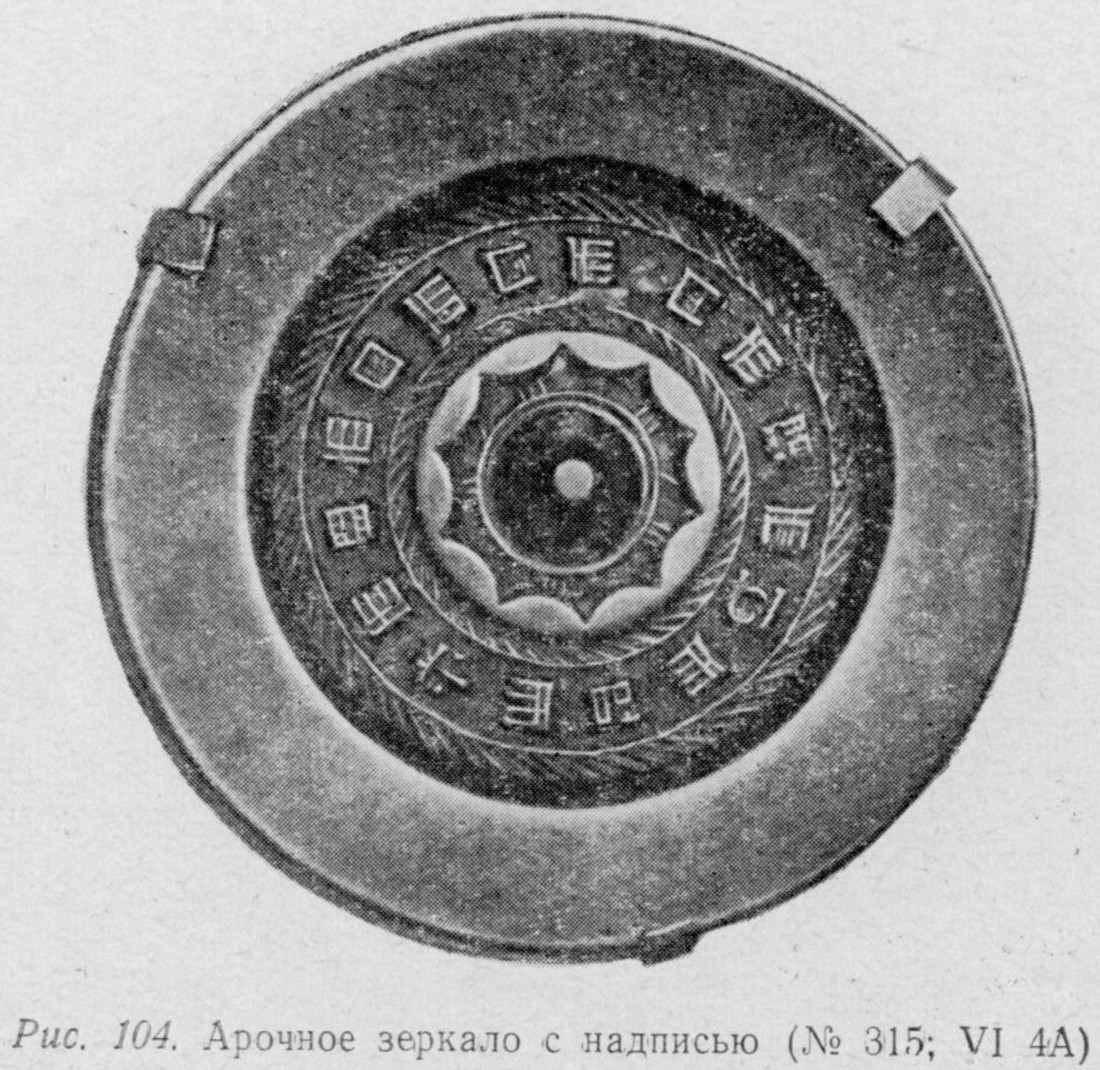 316 (VI 4Б) ^ Аналогия №315 Государственный Эрмитаж, №1286/67 Круглое, с круглой шишкой-петлёй в центре. Шишка окружена ободком и двумя кольцами. Внутренняя сторона наружного кольца состоит из восьми строк. Затем следует лента из параллельных чёрточек и ободок. Орнаментальная лента заполнена надписью: ...нэй эр цин эр и эр чжао эр мин эр гуан эр [?] эр эр эр жи эр юэ эр бу эр.... По краю ободок, лента из параллельных полосок и широкий ровный бортик. Копия XIII-XV вв. зеркала II-I вв. до н.э. Д — 10 см. Место находки: Минусинская котловина. Перевод надписи: «Внутренняя сторона [зеркала] ясная для того, чтобы отражать свет ... два солнца и луна не ...» Аналогия: Тё:сэн косэки дзуфу, №3793.