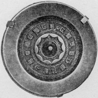 350 (VI 14) ^ Аналогия №348 Минусинский музей, №5036 В центре маленькая шишка-петля, окружённая ободком и кольцом, внутренняя сторона которого состоит из 16 арок. Между шишками помещено по шести шишечек, соединённых кривыми линиями. Орнаментальное поле окаймлено двойным ободком. По краю ровный бортик, внутренняя часть которого состоит из 16 арок. Д — 9,5 см. Место находки: улус Марьясово.