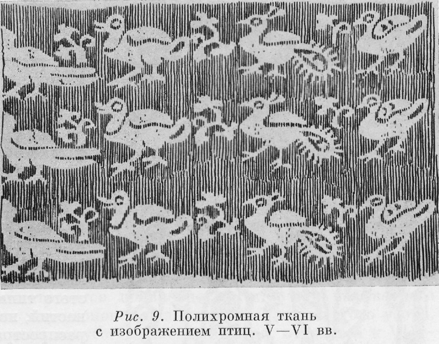 Рис. 9. Полихромная ткань с изображением птиц. V-VI вв.(Открыть Рис. 9 в новом окне) |
